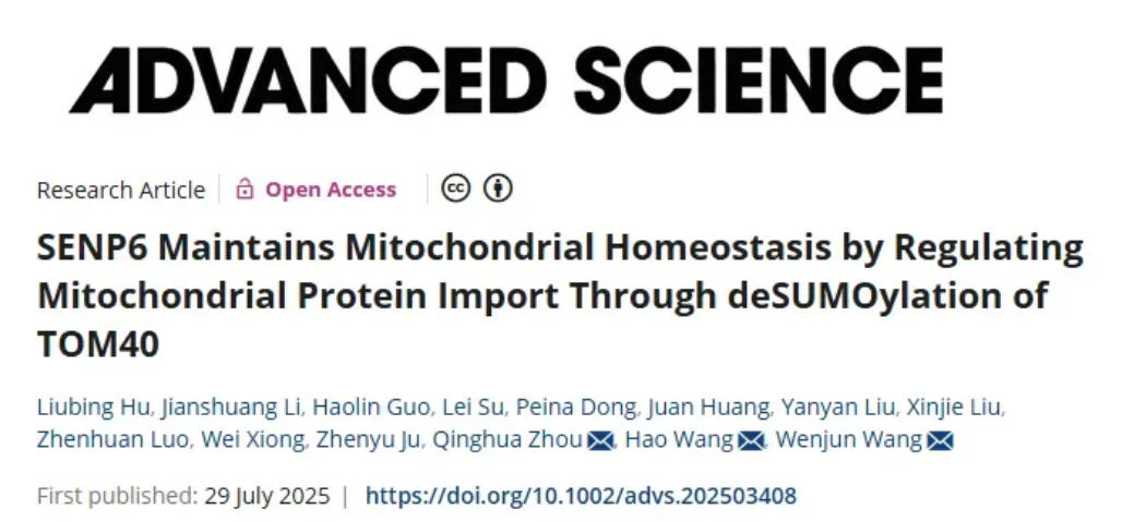 2025年7月29日,暨南大學(xué)王文君,暨南大學(xué)附屬第一醫(yī)院王昊、周慶華共同通訊在Advanced Science 在線發(fā)表題為“SENP6 Maintains Mitochondrial Homeostasis by Regulating Mitochondrial Protein Import Through deSUMOylation of TOM40”的研究論文。該研究闡明了SENP6敲低誘導(dǎo)的SUMO化會導(dǎo)致線粒體蛋白質(zhì)穩(wěn)態(tài)喪失,從而損害線粒體的形態(tài)和功能。