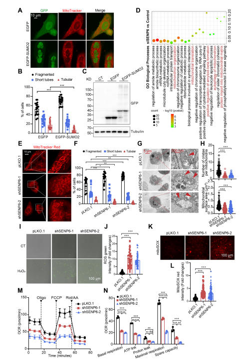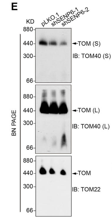 SUMO 化通過共價 SUMO 結(jié)合賴氨酸殘基來動態(tài)修飾蛋白質(zhì),由 E1 激活酶、E2 結(jié)合酶和 E3 連接酶介導(dǎo),而去 SUMO 化則由 SENPs 調(diào)控。與泛素化介導(dǎo)的降解不同,SUMO化會調(diào)節(jié)蛋白質(zhì)的活性、定位和穩(wěn)定性,從而影響基因表達、基因組完整性、細胞周期、細胞凋亡和免疫功能。最近的研究表明,SUMO化/去SUMO化參與調(diào)控線粒體的生物合成、動力學(xué)、線粒體自噬和線粒體未折疊蛋白反應(yīng)(UPRmt)。此外,線粒體蛋白質(zhì)輸入障礙和蛋白質(zhì)穩(wěn)態(tài)受損會引發(fā)酵母中線粒體蛋白質(zhì)的SUMO化,這表明SUMO化可能也在線粒體蛋白質(zhì)輸入系統(tǒng)中發(fā)揮作用。SENP6特異性地裂解polySUMO2/3鏈,從而調(diào)控DNA修復(fù)、細胞凋亡、衰老、著絲粒組裝、炎癥、小膠質(zhì)細胞極化、血管生成和核結(jié)構(gòu)。其功能障礙與淋巴瘤、核纖層蛋白病和骨骼衰老有關(guān)。然而,SENP6 在線粒體穩(wěn)態(tài)中的作用仍未得到深入研究。