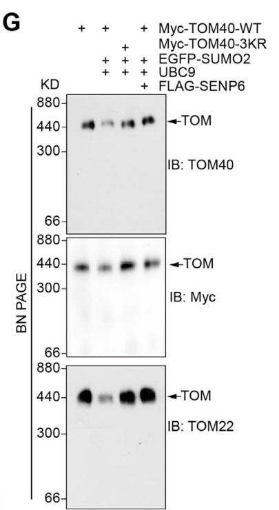 從機制上講,SENP6敲低通過SUMO化TOM40來抑制TOM復(fù)合物的組裝,從而阻礙線粒體蛋白質(zhì)輸入過程(包括TOM40前體),最終破壞線粒體穩(wěn)態(tài)。此外,研究還觀察到,CCCP 處理導(dǎo)致 3×Tg-阿爾茨海默病 (AD) 小鼠或 Aβ1-42 肽刺激細胞的腦內(nèi)線粒體中 SENP6 減少,同時 TOM40 SUMO 化增加。總之,這些結(jié)果表明 Aβ1-42 的積累可能通過抑制 SENP6 來增強 TOM40 SUMO 化,從而通過蛋白質(zhì)輸入障礙損害線粒體穩(wěn)態(tài),并可能促進 AD 的病理過程。該研究闡明了在線粒體應(yīng)激過程中TOM40 SUMO 化/去 SUMO 化調(diào)控線粒體輸入過程中的作用。